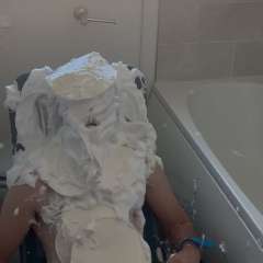 Luvs2pie was surprised by bsmessybakery with a big sloppy cream pie to the face